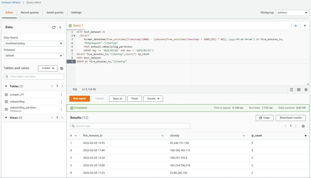 SELECT five_minutes_ts,"clientip",count(*) ip_countFROM test_dataset