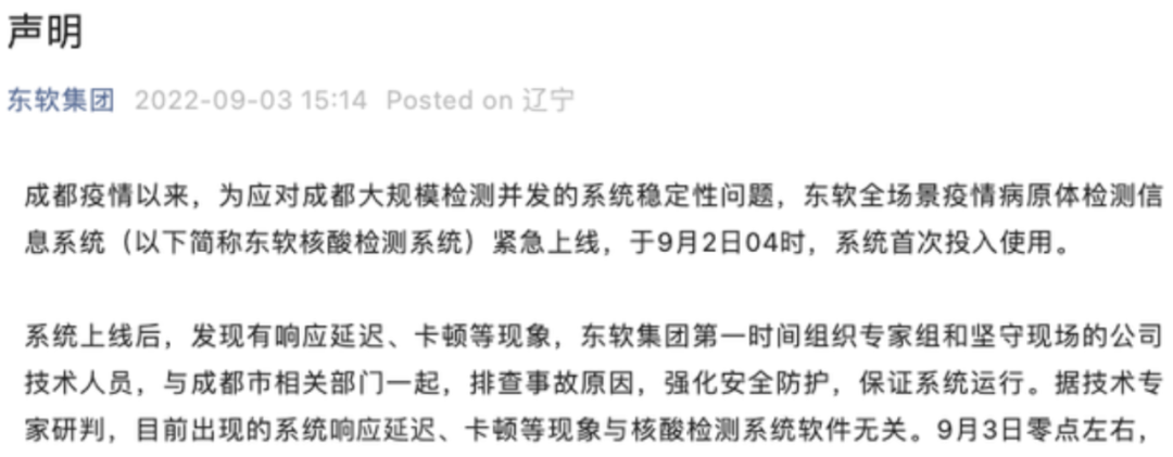 前天一大早醒来,各微信群都在传周五成都健康码崩溃的事情。虽然系统服务方东软下午发公告霸气回应:软件不存在问题,是网络问题,但网友们似乎并不买账: