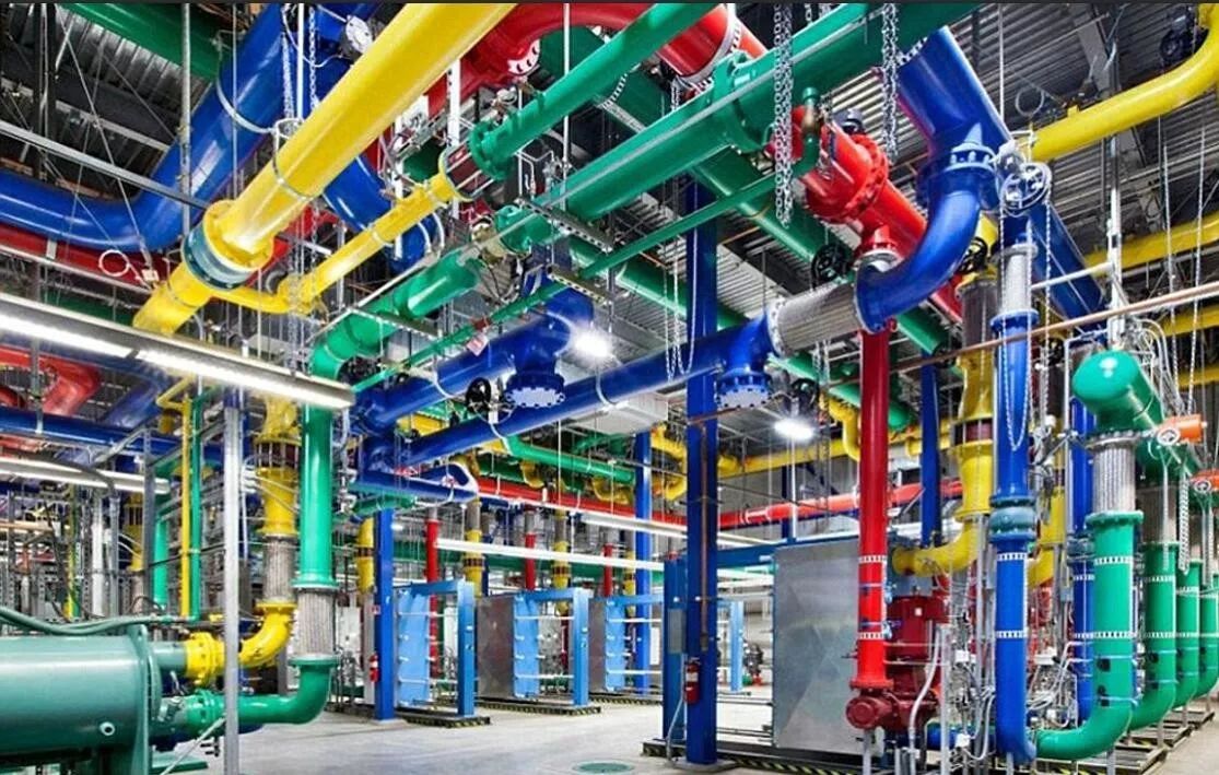 谷歌数据中心的这些彩色管道负责输送水。蓝色管道装冷水,红色管道装热水。