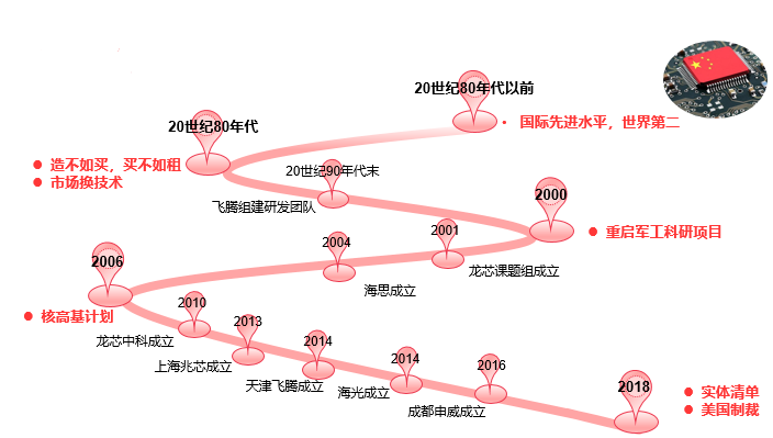 我国对国产CPU的研发支持始于上世纪90年代的“泰山计划”,由于种种原因,该计划不幸夭折。近年来国家对CPU的重视和发展的里程碑是在2001年5月,中科院计算所成立龙芯课题组,自此,我国开始了国产CPU的艰难探索之路。之后,国内还相继成立了诸如上海兆芯、成都申威、天津飞腾、华为海思、中科海光、中晟宏芯、展讯、小米、华芯通、紫光、北京君正等厂商公司,其中目前发展态势较好且可以应用在服务器领域的主要是龙、兆、飞、申威、海思和海光六大国产CPU。