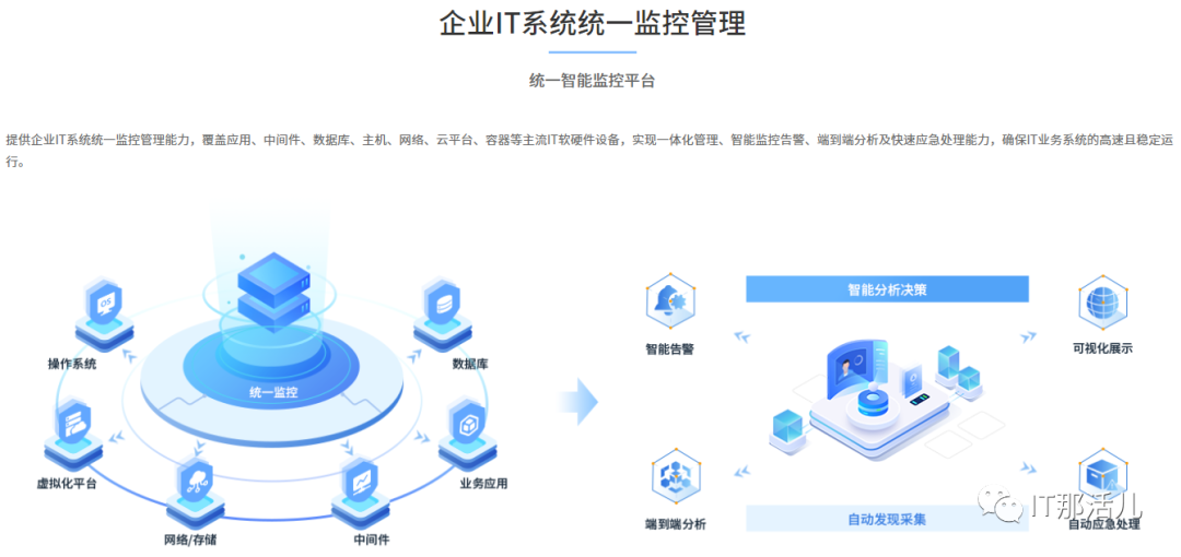 智能化统一监控展示方案,能够自动的对资源进行持续的监控,实时获取资源的资源配置及性能数据,通过预警阀值的配置进行自动告警推送;同时通过大屏的方式对资源数据和性能数据进行直观的可视化展示,有效的提高监控工作的效率,同时实时、全景的展示给资源管理提供有力决策保障 。