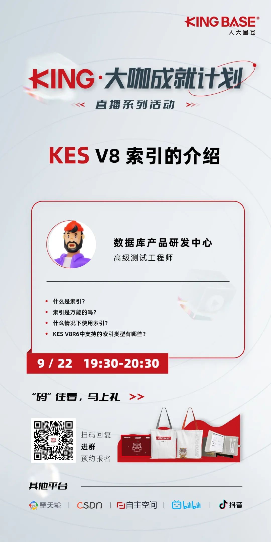 针对以上问题,人大金仓通过本次直播为大家介绍KES V8R6索引,从索引的基本概念引入,详细介绍索引通用的使用原则。再针对KES V8R6支持的索引方式和索引类型进行详细的介绍。帮助大家建立对KES V8R6索引的整体认知。