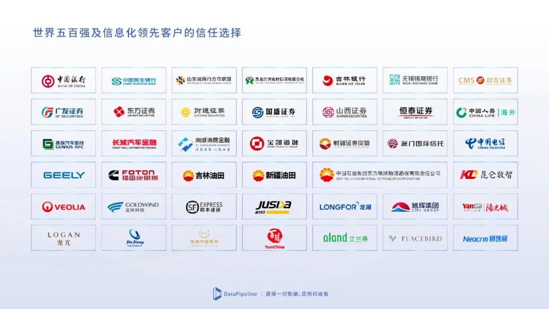 截至目前,DataPipeline已服务了中国银行、中国民生银行、中国石油、中国电信、中国人寿(海外)、吉利集团、财通证券、恒泰证券、长城汽车金融、福田康明斯等数百家客户,覆盖银行、保险、证券、能源、电信、制造、地产、零售、互联网等多个行业。
