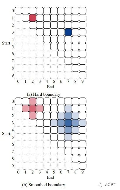 对实体边界进行了平滑处理,在之前的做法中,每个带标注的实体边界的边界概率为1,而其相邻的非边界token的边界概率为0,被称为硬边界,如图(a),这里平滑的做法就是拿出带标注的实体边界的一部分边界概率 拿出来平均分配给周围一定距离的非边界token,而这个带标注的边界token的边界概率变成了 1 - ,这样就达到了边界平滑的目的,如图(b)。