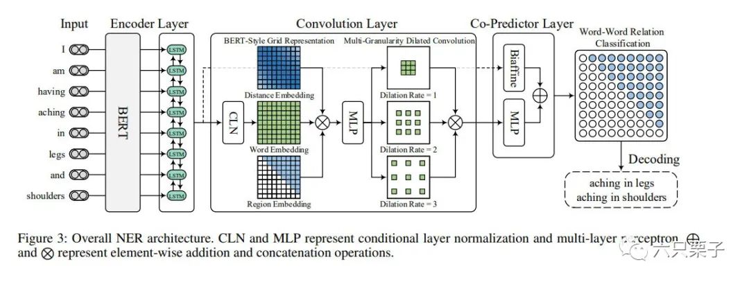 Encoder部分,Encoder部分采用的是BERT,再用双向LSTM进一步加强上下文表示, 卷积模块,卷积模块的主要作用是将token序列建模为word-word的网络表征,这里是一个2D结构,它主要包含三个部分: Conditional Layer Normalization(CLN):用于生成词对网络表示的归一化条件层,对Encoder部分输出的词向量,经过CLN层,可以得到文本中的词对表示(就是任意两个token之间的关系) BERT-Style Grid Representation:BERT 样式的网格表示构建以丰富词对的表示网格,根据Bert的三个输入token embeddings、position embeddings和segment embeddings,分别对单词、位置和句子信息进行建模。这里采用类似的思想,利用三个网络分别获得token之间的相对位置信息、token表示、CLN网络中的上三角区域信息,连接这三种表示并且采用多层感知器网络(MLP)来减少它们的维度信息获得网络中的位置区域感知表示。 Multi-Granularity Dilated Convolution:为了捕获近距离和远距离单词之间的交互的多粒度扩张卷积,采用具有不同扩张率 (膨胀率)(例如,)的多个二维扩张卷积 来捕捉不同距离的单词之间的交互,因为模型的目标是预测这些词之间的关系。 Co-Predictor Layer联合预测层 ,在卷积模块之后,获得了词对网格表示 ,使用 MLP 预测每对token之间的关系。通过与用于关系分类的(Biaffine Predictor)双仿射预测器合作来增强 MLP 预测器(基于词对网格表示的 MLP 预测器)。因此,同时采用这两个预测器来计算词对 ( ) 的两个独立关系分布,并将它们组合为最终预测。