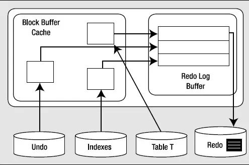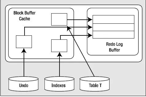 块缓冲区缓存中会有更多新的undo段块。为了撤销这个更新,如果必要,已修改的数据库表和索引块也会放在缓存中。我们还生成了更多的重做日志缓存区条目。下面假设前面的插入语句生成了一些重做日志,其中有些重做日志已经刷新输出到磁盘上,有些还放在缓存中。