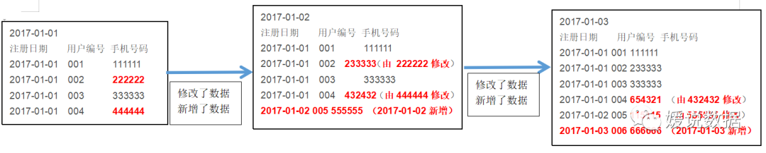 在2017-01-03这一天表中的数据是, 用户004和005资料进行了修改,006是新增用户: