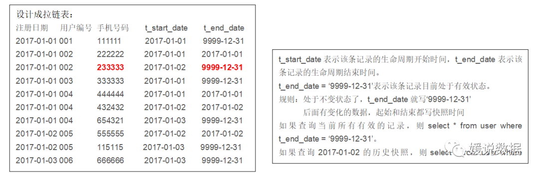 如果在数据仓库中设计成历史拉链表保存该表,则会有下面这样一张表,这是最新一天(即2017-01-03)的数据:
