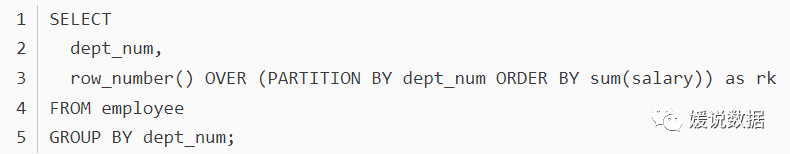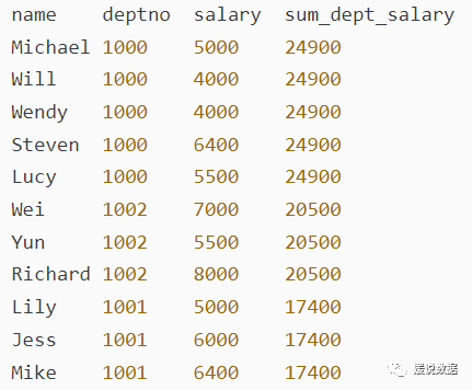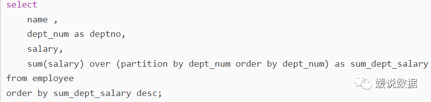 查询姓名、部门编号、工资以及每个部门的总工资,部门总工资按照降序输出窗口排序函数
