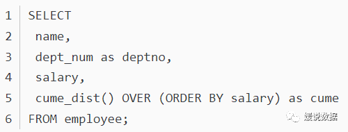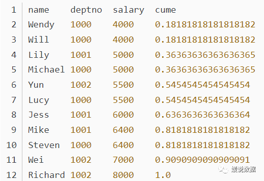 如果按升序排列,则统计:小于等于当前值的行数/总行数(number of rows ≤ current row)/(total number of rows)。如果是降序排列,则统计:大于等于当前值的行数/总行数。比如,统计小于等于当前工资的人数占总人数的比例 ,用于累计统计.