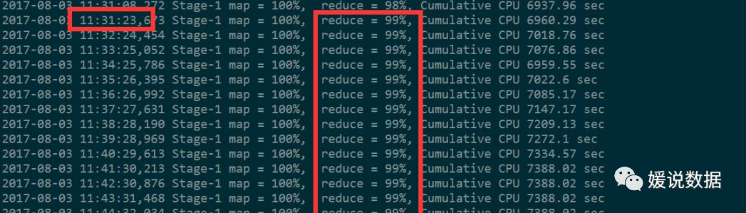 任务进度长时间维持在 99%或者 100%的附近,查看任务监控页面,发现只有少量 reduce 子任务未完成,因为其处理的数据量和其他的 reduce 差异过大。单一 reduce 处理的记录数和平均记录数相差太大,通常达到好几倍之多,最长时间远大 于平均时长。