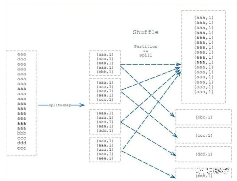 hive执行底层转为MapReduce数据处理过程,数据经过 map后,由于不同key 的数据量分布不均,在shuffle 阶段中通过 partition 将相同的 key 的数据打上发往同一个 reducer 的标记,然后开始 spill (溢写)写入磁盘,最后merge成最终map阶段输出文件。