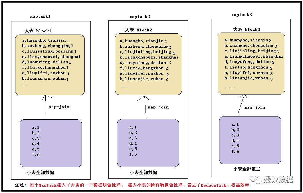3)大小表关联查询产生数据倾斜 注意:使用map join解决小表关联大表造成的数据倾斜问题。这个方法使用的频率很高。map join 概念:将其中做连接的小表(全量数据)分发到所有 MapTask 端进行 Join,从 而避免了 reduceTask,前提要求是内存足以装下该全量数据