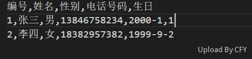 假设我们现在没有数据库,我们想开发一个本地的电话本软件,也就是手机中通讯录,这个软件有记录的功能,需要记录联系人姓名,电话号码,生日,性别等信息,由于是要持久化数据,所以我们只能写到文件中,比如phone.txt.例如: