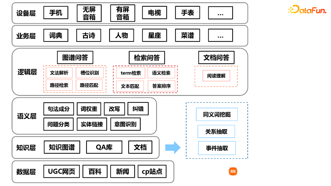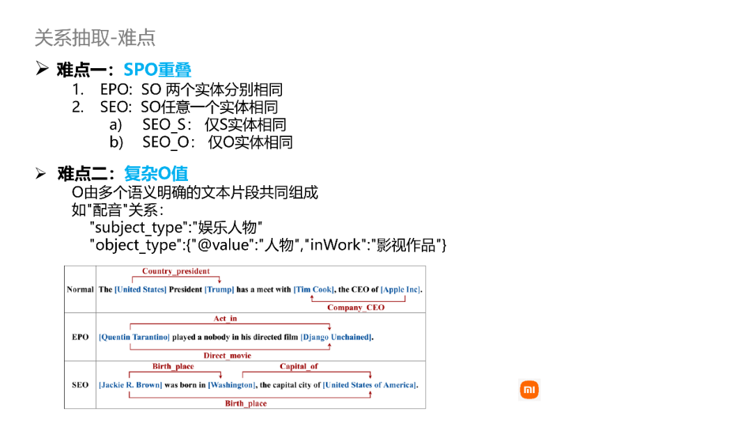 首先和大家介绍一下小爱同学的应用场景。通过小爱同学,可以方便快捷的访问小米的各种智能硬件设备,包括扫地机器人、电视、空调等。小爱同学主要包括内容、信息查询、互动、控制、生活服务、基础工具这六大方面的服务。今天要分享的智能问答,主要解决的是有客观事实性答案的这一类query,主要是为了满足用户信息查询类的需求。下图是智能问答的框架,主要由数据层、知识层、语义层、逻辑层、业务层、设备层组成。在知识层,本文将分享信息抽取的相关工作。逻辑层主要包括图谱问答、检索问答和文档问答,今天主要分享图谱问答。在业务层,基于问答模块,可以在词典、古诗、人物、星座、菜谱等不同的功能垂域来进行业务层的开发。最后,针对不同的智能硬件,我们在设备层上进行相应的适配,来满足用户在不同终端的需求。目前,小米的知识图谱实体量是数十亿,三元组spo量超百亿,这些知识囊括了书籍、本地生活、字词、古诗、房产等不同领域的信息。