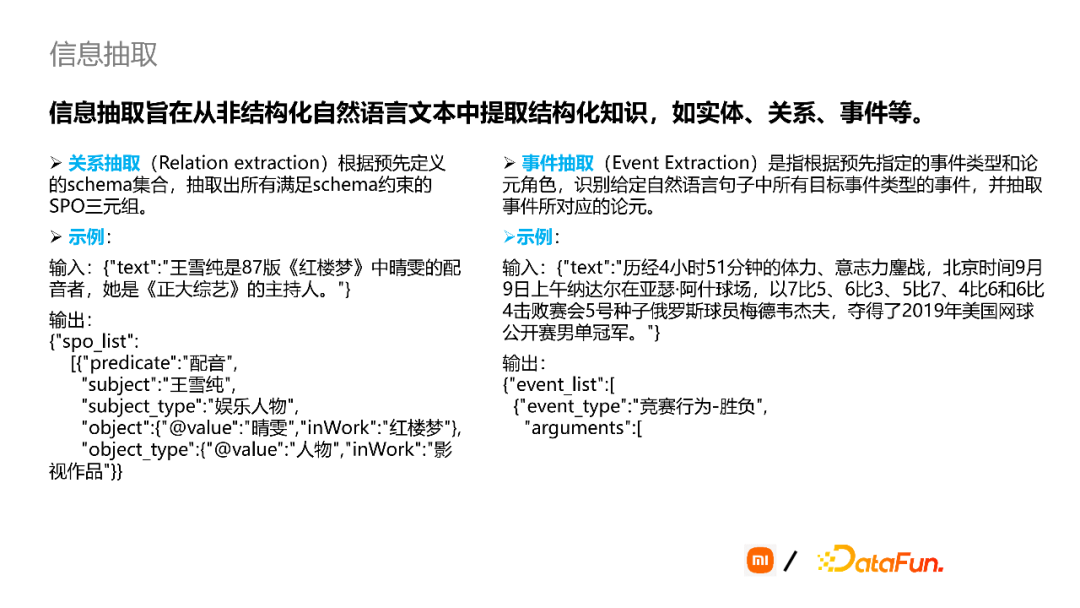 信息抽取是指从非结构化的自然语言文本中提取结构化的知识,如实体、关系、事件等。关系抽取会预先定义好一个schema,然后抽取所有满足schema约束的SPO三元组。事件抽取也是先预先定义好事件类型和论元角色,再从输入的自然语言文本当中识别事件类型,以及这个事件类型对应的一些事件要素。这里举一个关系抽取的例子,“王雪纯是87版《红楼梦》中晴雯的配音者,她是《正大综艺》的主持人”,我们需要去识别出来subject是王雪纯,predicate是配音,object是人物,配音的人物是晴雯。这里的object是一个复合类型,需要同时识别出来配音的角色是谁,属于哪部影视作品。这里介绍的方案,是我们参加“2021语言与智能技术竞赛:多形态信息抽取任务”的亚军方案。我们主要从关系抽取和事件抽取两个方面介绍信息抽取。在关系抽取中,除了复杂o值之外,还有spo重叠这种比较常见的难点,如s和o两个实体分别相同。例如,吴京是战狼的主演,同时吴京也是战狼的导演。此时吴京和战狼这两个实体,在这两种关系中都是相同的。spo重叠还有另外一种形式是,s和o当中,其中一个实体是相同的。