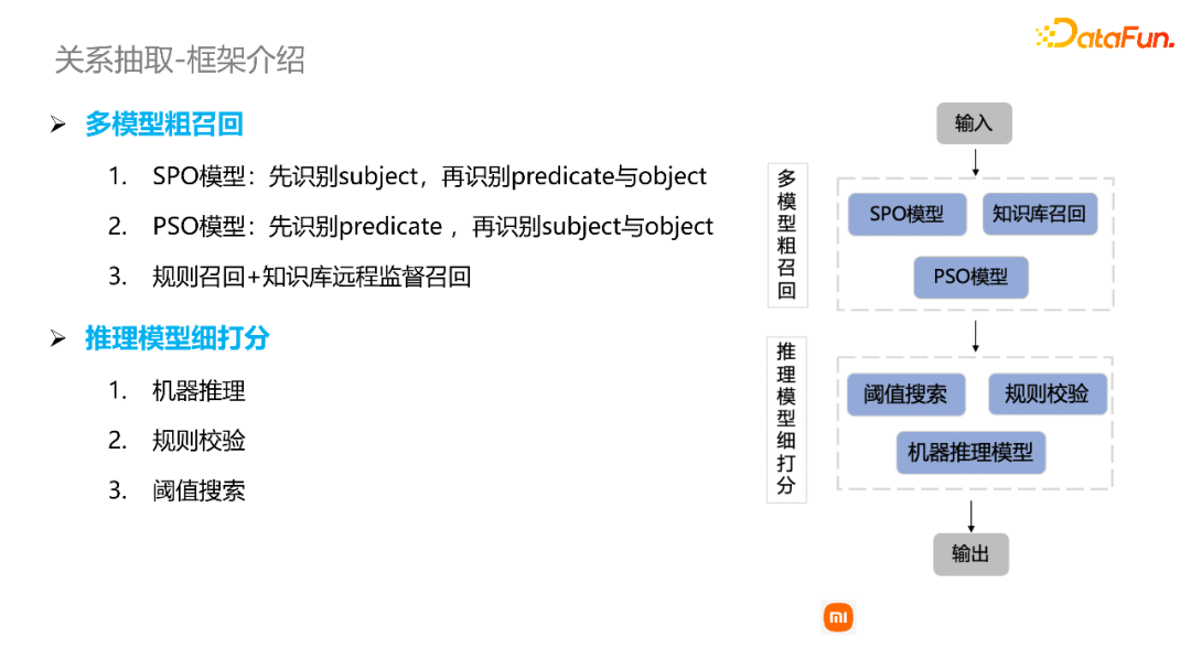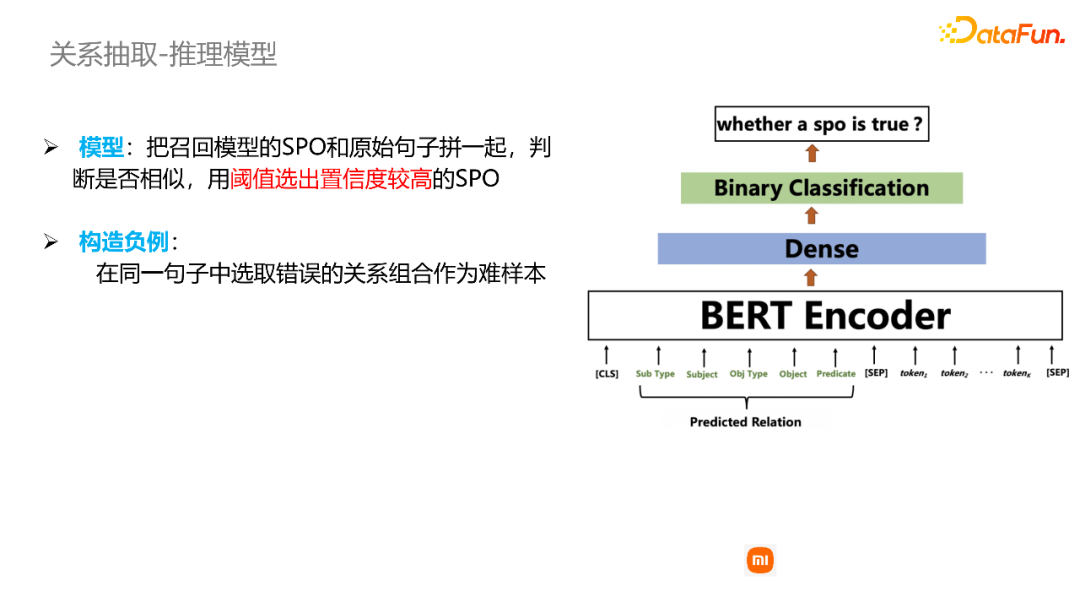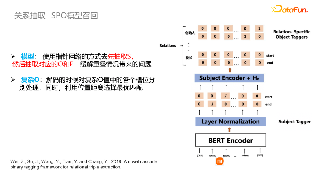 解决框架主要由多模型粗召回和推理模型细打分两部分组成。SPO模型:首先通过指针网络的方式抽取s,然后根据s在schema当中对应的p,再通过指针网络的方式找到每一个p在文本当中对应的o的文本片段。上图所示为SPO模型的大体框架图,输入文本后,首先通过编码层对语义信息进行表示,再通过解码网络找到其中的subject,然后将这个subject和输入文本连接起来,再在schema中获取其涉及到的所有谓词,通过指针网络来找到每个谓词下是否存在对应的片段,从而找到这个p和o的结果。对于复杂o值,我们对当中各个槽位都分开来分别处理,并且结合位置距离来选择最优的匹配,最终将复杂o值各个槽位得到的文本结果组合起来作为这个复杂o值的结果。