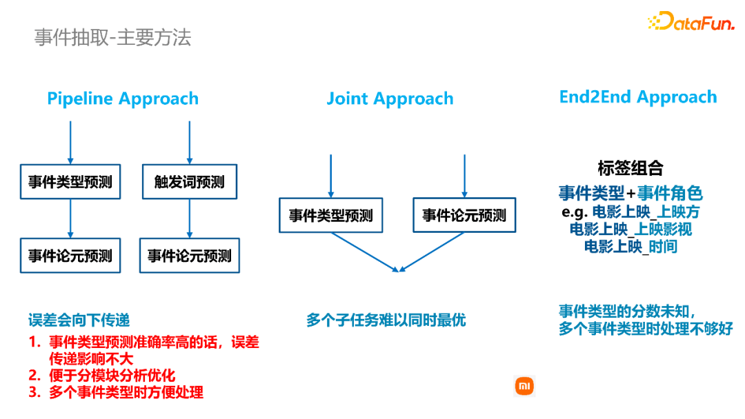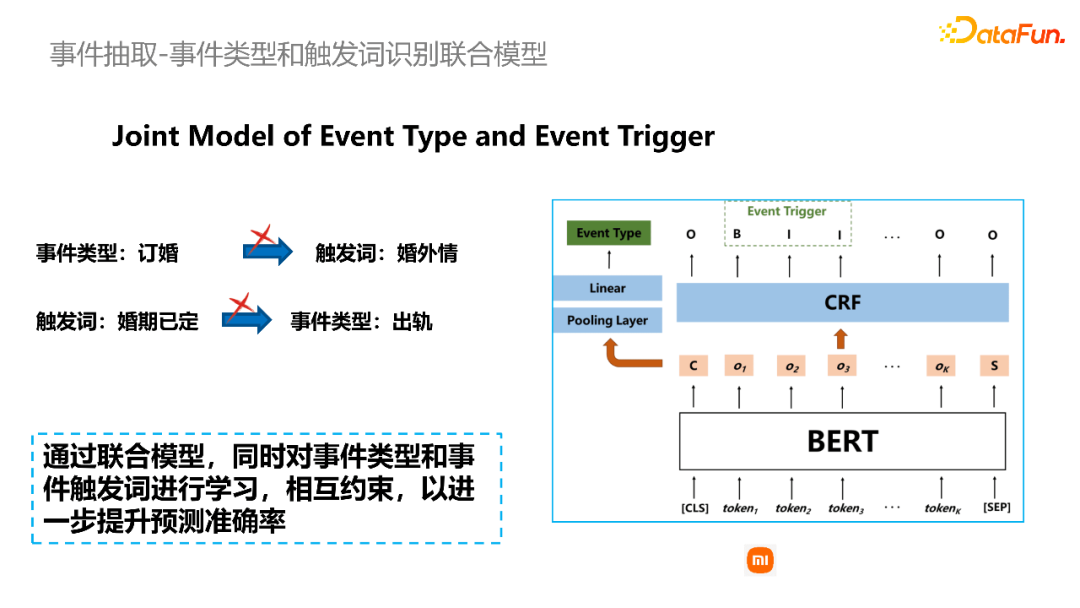 第一种是流水线的方式,将事件类型和事件要素的抽取作为流水线串连起来,首先去预测事件类型,得到结果之后,再基于事件类型去预测事件的角色和事件的论元等相关要素的结果。另外基于触发词这种方式,流水线的模式是先抽取触发词,第二步再基于触发词去抽取对应的事件要素。第二种是联合的模型,将前述的事件类型预测和事件要素抽取联合起来进行多任务学习。为了让多个子任务同时达到最优,收敛过程相对较难一些。第三种是端到端的方法,我们对标签组合进行了一些调整,将事件类型和事件角色名组合起来,构成一个新的标签组合。通过BIO标注后可以一步到位地识别文本中包含的事件类型,和这个事件类型下每个角色的取值。因为是直接通过序列标注的方式抽取得到两个结果,所以事件类型的分数我们无法得知,因此存在多种事件类型时处理不够好。如果事件类型的准确率较高,可以优先选择流水线方式,因为事件类型本身误差小,所以误差传递的影响也不大。另外基于流水线方式比较便于后续进行分模块的分析优化。在文本当中存在多个事件类型的情况下,基于流水线方式,可以把第一步事件类型预测得到的多个结果,逐一输送给第二步要素抽取的模型,分别识别每个事件类型对应的事件要素。它对多种事件类型的处理会更好。所以我们的选型也是采用的流水线的方式。在模型的选择上,常见的有指针网络和序列标注这两种。指针网络的监督信号比较稀疏,模型不好收敛。序列标注的缺点是处理不了overlap的问题。由于任务中overlap占比少,序列标注模型的准确率受overlap的影响并不大。另外也可以通过一些规则来部分地解决overlap的问题。同时序列标注的训练更容易、效果也更好。所以在事件抽取任务中我们选择了序列标注模型。在事件抽取任务中,有的研究者基于事件类型做要素的抽取,有的研究者基于事件触发词做要素的抽取。在这里我们提出事件类型和触发词的联合识别模型。我们发现事件类型和触发词实际上是相互影响的,比如“订婚”这个事件类型,触发词不可能是“婚外情”。相反地,如果给的触发词是“婚期已定”,它对应的事件类型不可能是“出轨”。所以我们是通过联合模型来同时对事件类型和事件触发词进行学习,以进一步提升预测的准确率。如下图所示,首先通过一个共享的编码层来对语义信息进行表示,输出层中,事件类型预测采用的是线性输出层,事件触发词识别采用的是一个CRF的输出层。