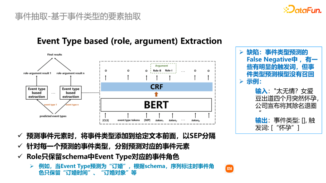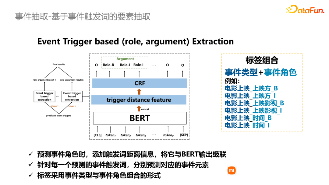 在识别得到事件类型和事件触发词之后,我们设计了并行模型进行要素抽取。第一个模型基于事件类型,第二个模型基于事件触发词。在基于事件类型的抽取模型当中,我们将第一步识别得到的事件类型,连接到输入的文本之前,再通过序列标注的方式来抽取对应的事件要素。