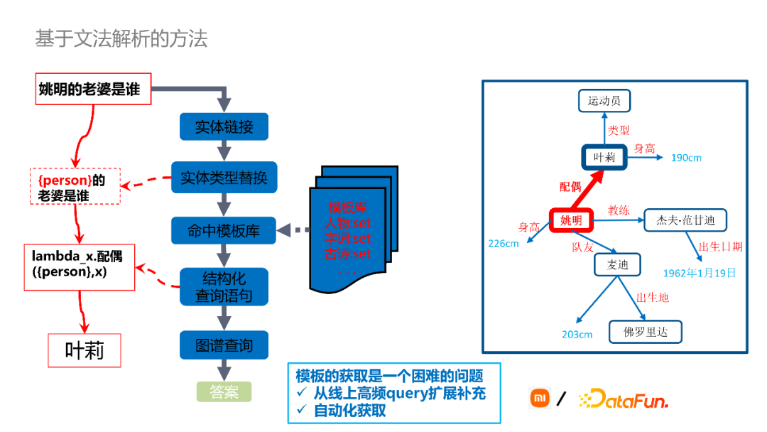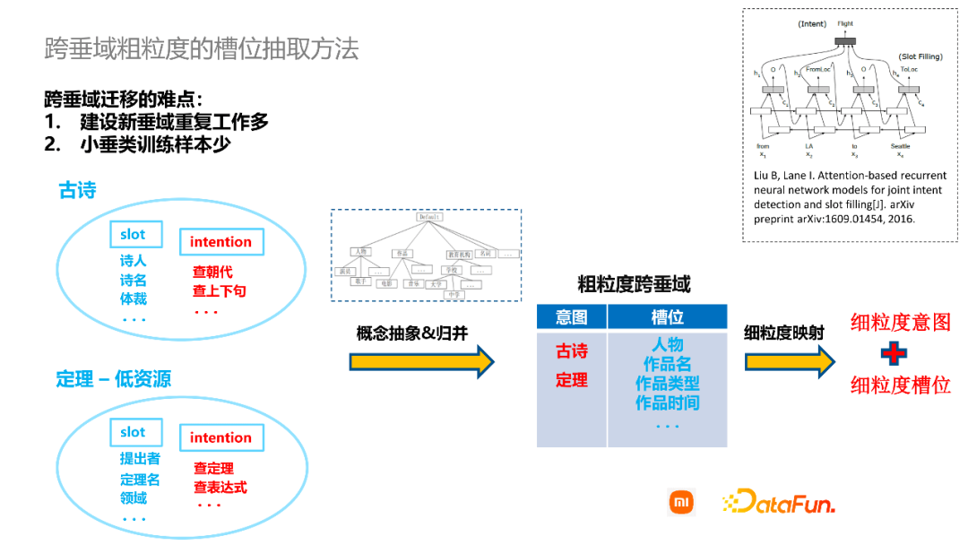 将这两种方式抽取的事件要素进行投票组合,得到最终的抽取结果。基于信息抽取模型得到的结构化知识,可以补充到知识图谱中,作为下游图谱问答的数据基础。如下图,对用户query进行解析,从模板库中找到与用户query匹配的模板,再通过这个模板把用户非结构的query解析成为结构化的查询语句,进而从图谱中去查找得到答案。这个过程是比较简单的,但主要的问题在于如何高效快速的获取大批量的模板。一方面可以从线上高频query进行扩展补充,这是从业务出发的一种方式,能够尽快满足用户需求。第二种,可以通过挖掘的方式来自动化地获取。该方法的泛化性能会相对更好。它的基模型是意图识别和槽位抽取的联合模型。通过这个联合模型,对用户query的意图和槽位同时进行识别,从而回答用户的问题。这种方式不依赖模板,所以泛化性更好。通过这种方式进行垂域建设有一些缺陷。比如建设好一个古诗垂域,它包含查朝代、查上下句等功能点,包含诗人、诗名、体裁等槽位,在这个意图和槽位体系之下,挖掘一些样本进行模型训练、线上部署,以回答用户在线上的问题。如果又需要建设一个新的垂域,比如数学定理垂域,这个垂域不仅是一个新的垂域,而且也是一个低资源垂域,那么我们不得不把古诗垂域建设的过程再重复一遍,而且小垂域的训练样本获取也比较困难。所以我们提出了一个跨垂域粗粒度的意图识别和槽位抽取方法。具体来说,是将不同垂域涉及到的槽位根据概念图谱来进行抽象,比如诗人和提出者都属于人物,那么我就可以将诗人和提出者定义为人物这样一个槽位。诗名和定理名,可以认为都是作品名。除了合并的槽位之外,各个垂域还有一些特有的槽位,我们将它们直接保留下来。与此同时,也把细粒度的意图直接上升到粗粒度的意图。这样就可以联合不同垂域的样本,训练一个跨垂域粗粒度的模型。在这种跨垂域的模型中,定理垂域就可以利用古诗垂域的训练样本,实现领域知识的迁移。在模型训练好之后,就可以在线上预测用户query的意图和槽位,最后通过映射关系,将粗粒度的槽位和意图映射到细粒度的意图和槽位之上,用于进行下一步的解析。基于路径检索的方式,不需要对用户query进行解析,而是先检索候选的路径,然后从中进行筛选找到正确的解析路径。这里主要介绍我们参加“CCKS2021生活服务领域知识图谱问答评测”的冠军方案。