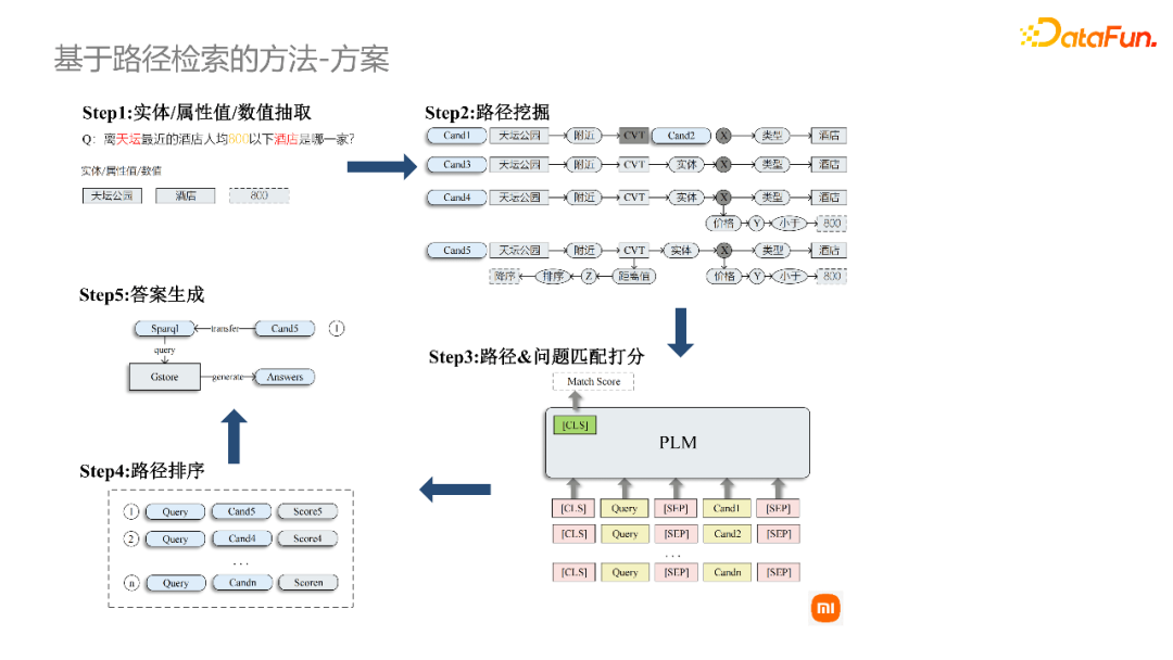 经过路径匹配排序之后,可以得到语义上和用户query最接近的候选路径,进一步还可以结合一些业务特征对候选路径进行重排序,最后从图谱中查找正确答案。在评测结束之后,我们将这个方案在业务中进行了落地,落地时为了追求性能和效果的平衡,落地方案和前面稍有差别。在实体和属性值抽取时,通过实体链接来找到query当中的核心的实体。在路径挖掘时,自研了一套路径检索和路径挖掘的方式,能够提高路径挖掘的性能。得到候选路径后,我们会对候选路径的规模进行约束,比如取前20条候选路径进行语义匹配。最终输出排名第一的候选路径,从图谱中查找正确答案返回用户。