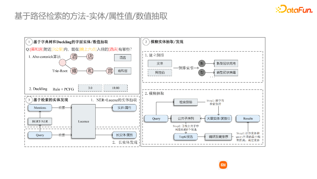 主要涉及两类约束,第一类约束是过滤约束,第二类约束是排序约束。对于这种带约束的复杂query,我们需要做特殊的处理。整体来讲,我们采用的技术方案的流程为:第一步识别实体和属性值,第二步进行路径的挖掘,第三步进行匹配打分,第四步进行路径排序,最终根据最优路径从图谱中查询答案。第一步我们需要从query当中找到这个问题涉及到的一些实体、属性值、数值,主要采用三类方式:①基于AC算法的字面匹配,识别query中涉及到的字面值。②模糊匹配。实际上用户query中有一些实体提及mention和图谱中实体名称并不完全一样。这时我们需要进行模糊匹配。通过建立倒排索引来找到和mention比较相关的候选实体,计算每个候选实体的编辑距离,来对候选实体进行排序。③基于NER模型,来找到query当中可能涉及到的实体片段。实体、属性值抽取是基础的一步,也是比较关键的一步,需要抽取到query中关键的语义信息。如果没有抽取到,后面路径无论如何扩展,都不能找到正确路径。第二步,基于抽取得到的实体和属性值,进行路径的挖掘。路径挖掘主要包括两个步骤,首先是基础的路径扩展,接着是对复杂query进行约束挂载。路径扩展,是以query中的抽取得到的实体为出发点,通过新增三元组来扩展路径。中间节点可以继续作为起始节点来新增三元组。同时我们可以将找到的不同路径,在中间节点相同的情况下进行组合,形成语义信息更丰富的一条路径。通过这种路径扩展和组合,尽可能多地挖掘候选路径,最大可能的将query对应的正确解析路径包含在候选队列当中。