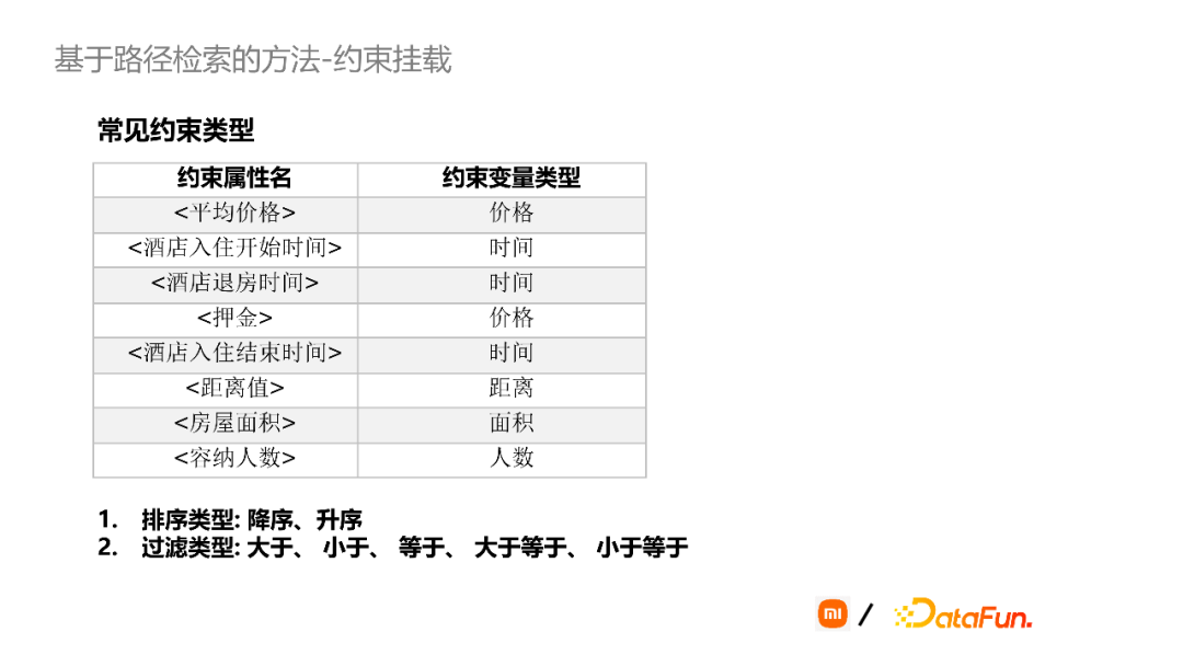 约束挂载如上图所示。“离天坛最近的酒店人均800以下酒店是哪一家”,首先通过路径扩展得到上图最上方所示的路径,然后进一步约束CVT节点对应的距离值,同时对酒店实体X的价格约束为小于800。通过上图方式,我们将约束可以看作一种特殊的三元组。比如要求价格小于800块钱,那么“小于”作为谓词,“800”就是作为object值。对于排序约束,将“排序”作为谓词,然后“降序”作为object。将约束信息统一处理成三元组是为了下一步路径匹配的需要。