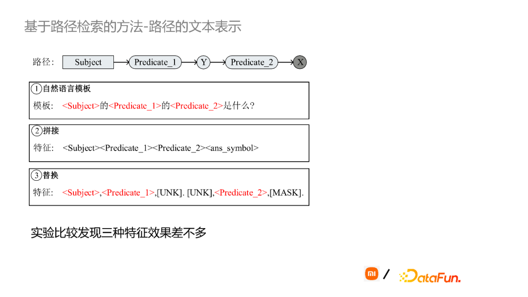 我们总结了可以加约束信息的常见属性,比如平均价格、酒店入住时间、押金、距离值、房屋面积等。在路径扩展过程中,如果发现某一个属性的取值是数值时,就可以对它进行约束挂载,从而表达出query中的复杂语义信息。下一步是路径匹配。需要在候选路径中找到最有可能的路径。具体方法为:将路径表达成文本的形式,把它建模成一个语义匹配的任务。路径的文本表示,这里介绍三种方式:第一种方式是设计一个模板将路径表示为一句话;第二种方式是把这个路径中的subject、predicate以及答案节点拼接起来;第三种方式和第二种方式相似,但是把中间节点通过[UNK]字符保留下来。通过实验对比,这三种方式的匹配效果差异不大。选择任意一种方式皆可。