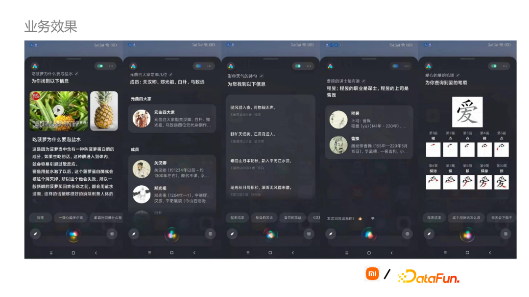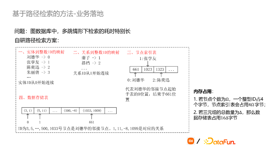 这里简单介绍一下我们自研的路径检索工具。我们将图谱里的实体和关系,进行整型id的映射,然后通过一个节点索引表来记录每个实体对应的SPO三元组,比如刘德华所对应的三元组的终止节点在661,也就是说找刘德华的三元组时,可以快速地在数据存储表中的第0位到第661位进行查找,这里的查找可以通过二分法进一步加速。通过这种方式使检索耗时大大减少,内存的占用也会非常的小。最后我们列举了几个图谱问答的示意效果图。图谱问答的结果更适应结构化展示的需求,能满足精品化的产品需求,为用户提供更好的使用体验。