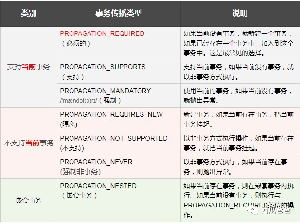 Spring 事务的传播机制,支持继续使用当前事务的主要有Propagation.REQUIRED,Propagation.SUPPORTS,Propagation.MANDATORY,不支持继续使用当前事务的包括Propagation.REQUIRES_NEW,Propagation.NOT_SUPPORTED,Propagation.NEVER。还有一个与 REQUIRED 行为类似的 NESTED 嵌套传播。