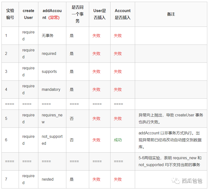 public class UserService {// ...@Transactional(propagation = Propagation.REQUIRED)public void createUser(String name) {jdbcTemplate.update("INSERT INTO `user` (name) VALUES(?)", name);accountService.addAccount(name, 10000);}}@Servicepublic class AccountService {// ...@Transactional(propagation = Propagation.XXX)public void addAccount(String name, int initMoney) {String accountid = new SimpleDateFormat("yyyyMMddhhmmss").format(new Date());jdbcTemplate.update("insert INTO account (account_name,user,money) VALUES (?,?,?)", accountid, name, initMoney);// 出现分母为零的异常int i = 1 0;}}