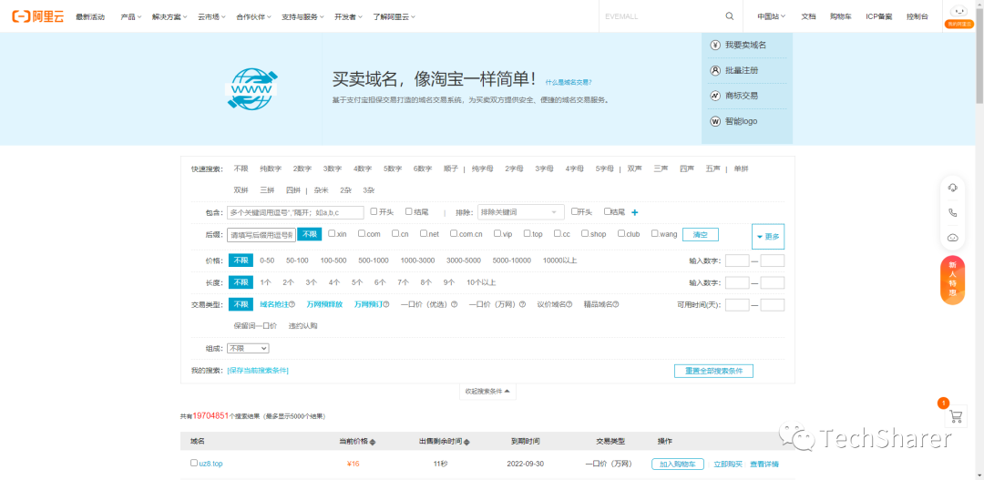 通过阿里云控制台,进入域名买卖界面,按照需求筛选你想要的域名,注意:购买域名需要上传身份信息,实名认证。
