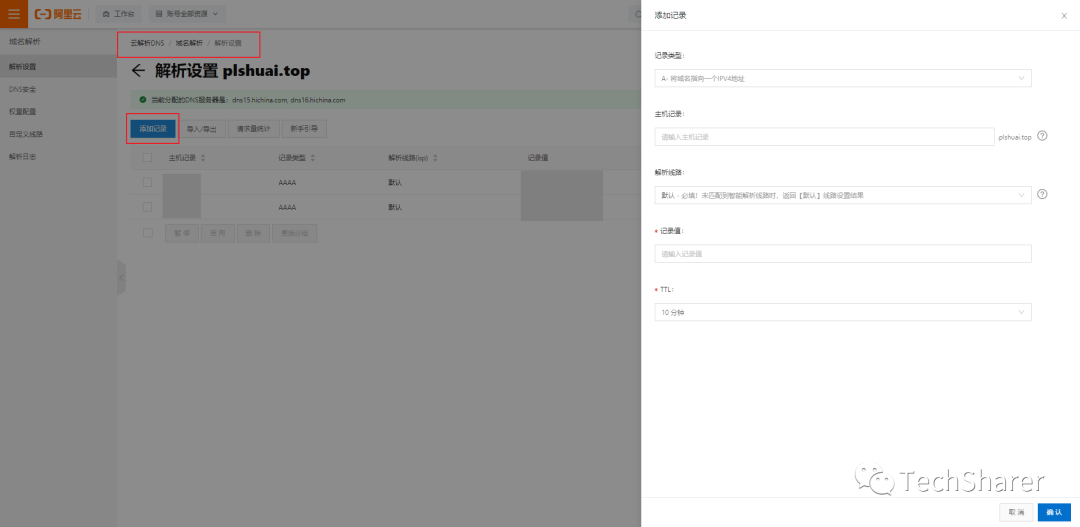 通过控制台,进入”云解析DNS“---”解析设置“---”添加记录“,你就可以手动添加域名解析了,这里不用手动添加,我们后续通过脚本或者软路由添加。