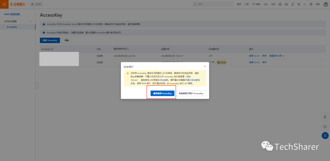 这里你可以选择:”子账号accesskey”通过设置细分权限来增加安全性,这里我图省事选择所有执行权限的AccessKey
