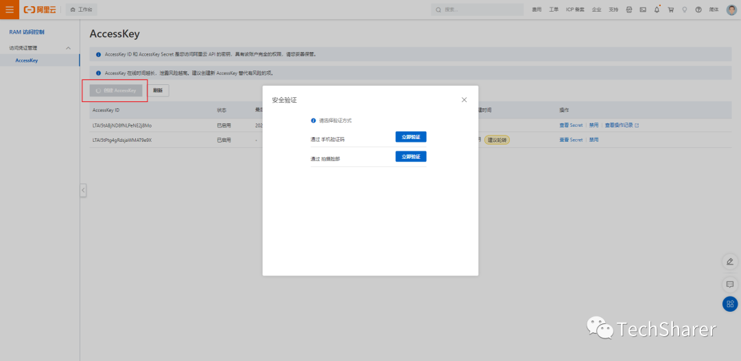 点击左上角:创建AccessKey,通过安全验证后,你就获取到一个AccessKey ID和Secret。注意:保存好这个!