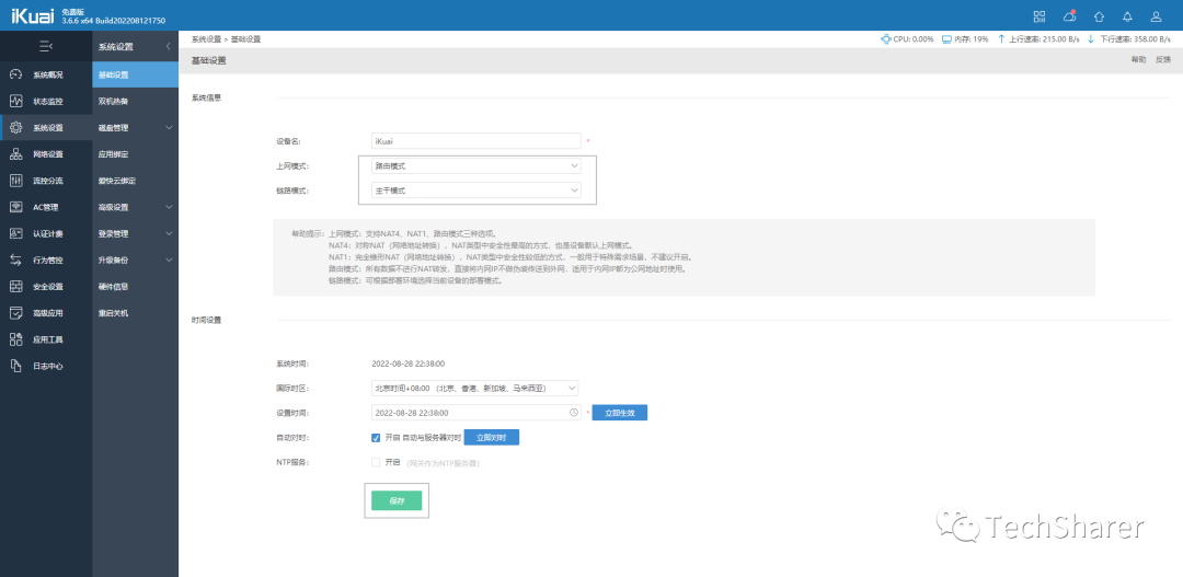 设置路由模式:选择“系统设置”---“基础设置”,上网模式改为:路由模式,链路模式:主干模式。