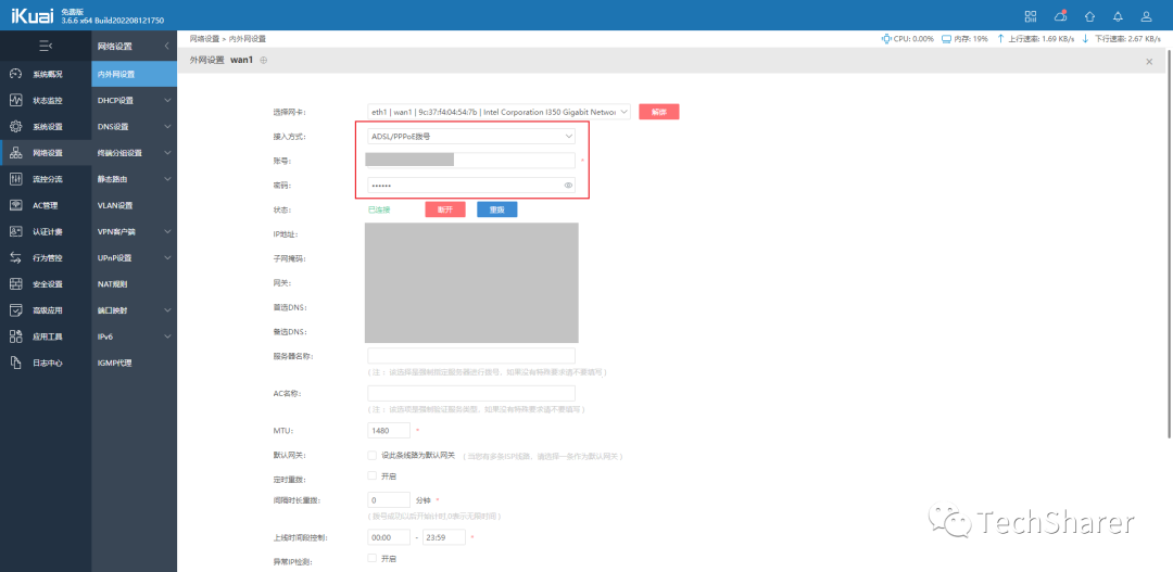 按照“设置网卡绑定”---“设置lan/wan地址”的顺序,设置好端口绑定关系,其中lan1口地址为网关地址,wan口地址无需设置,通过后续PPPoE拨号获得。通过设置的lan1地址+端口号访问iKuai管理界面。