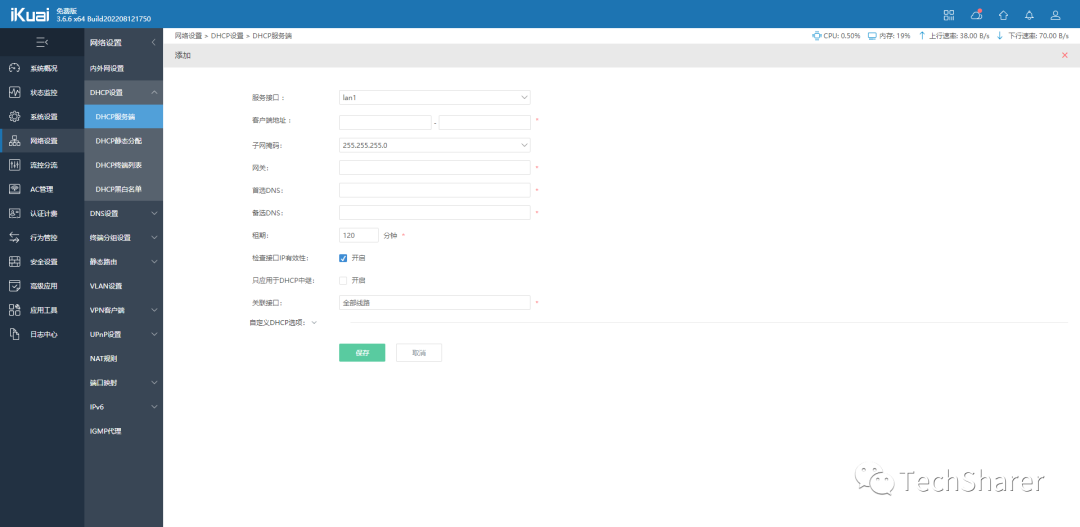 设置DHCP服务:选择“网络设置”---“DHCP设置”---“DHCP服务端”---“添加”,客户端地址为lan1地址同网段即可,网关选择lan1地址。