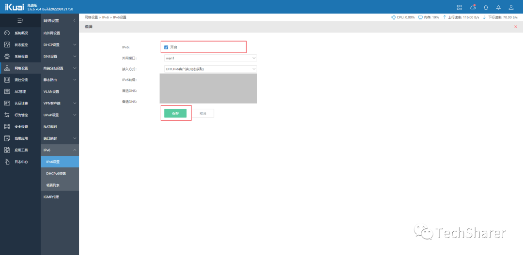 设置ipv6:选择“网络设置”---“IPv6”---“IPv6设置”---“外网配置”---“编辑”,勾选ipv6开启,即可