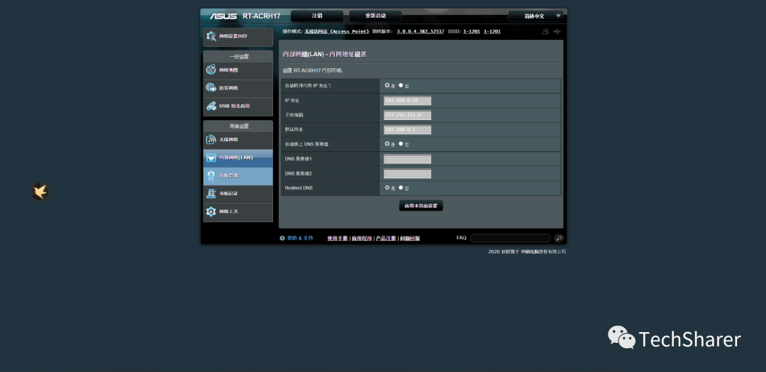 通过ikuai软路由进行拨号后,无线路由器不再需要路由功能,我们通过修改工作模式为ap,即可实现手机,笔记本电脑等无线终端通过无线访问。下面以华硕路由器为例: