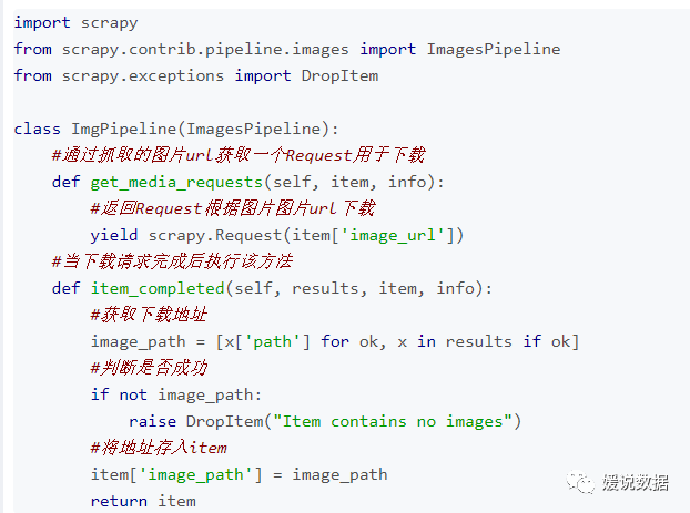 get_media_requests(item, info)方法是通过抓取的图片url来返回一个Request,这个Request将对图片进行下载。