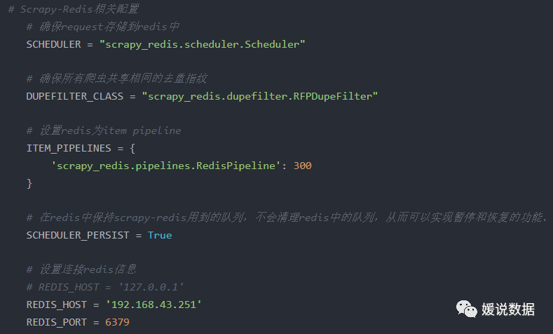 将爬虫中的start_urls删掉。增加一个redis_key="xxx"。这个redis_key是为了以后在redis中控制爬虫启动的。爬虫的第一个url,就是在redis中通过这个发送出去的。