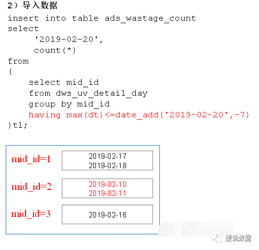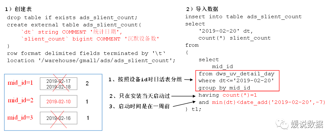 为了分析沉默用户、本周回流用户数、流失用户、最近连续3周活跃用户、最近七天内连续三天活跃用户数,需要准备隔了一个星期的2天的数据,比如这里,我们准备了2019-02-12、2019-02-20日的数据。