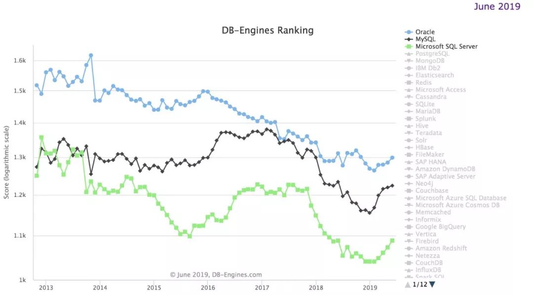 我们再来看一下趋势变化,第一梯队的三个数据库产品基本保持了统一走势,近六个月都获得了止跌回升的好成绩,但是和2018年同期相比,都呈现下降或基本持平。这三个数据库都走过了巅峰时代,现在在苦苦等待挑战者的出现: