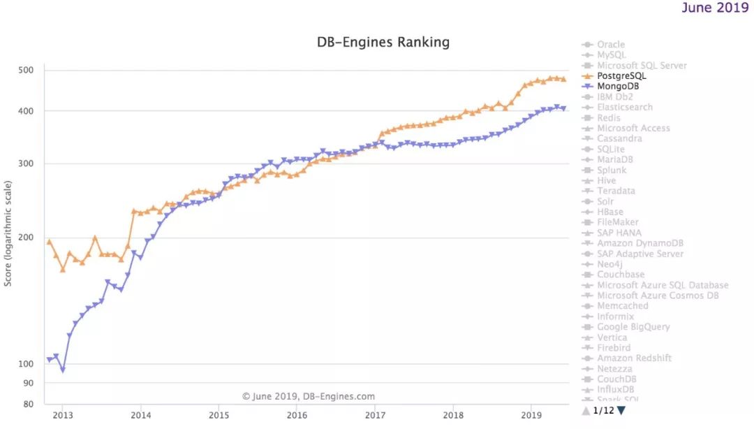 唯有 PostgreSQL 和 MongoDB 才具备这样的潜质,这两者同比都获得超过 60分的涨幅,PostgreSQL 的积分较去年上涨了 16%。如果 PostgreSQL 能够获得持续的发展,则有望在 5 年左右冲入第一梯队。