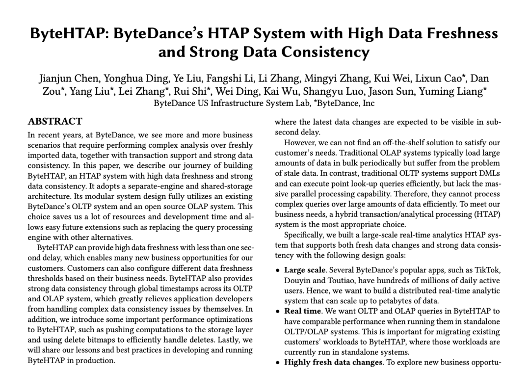 《 ByteHTAP : ByteDance’s HTAP System with High Data Freshness and Strong Data Consistency》介绍了字节跳动为应对业务场景而构建的具有高数据新鲜度和强数据一致性的 HTAP 系统。