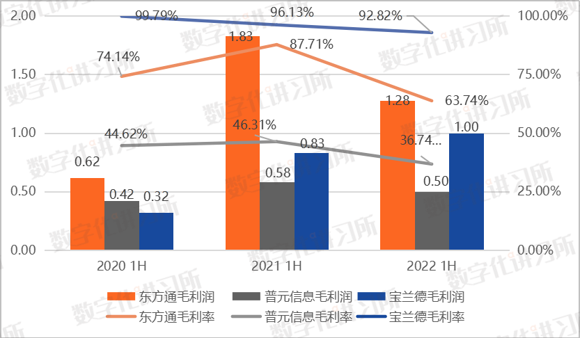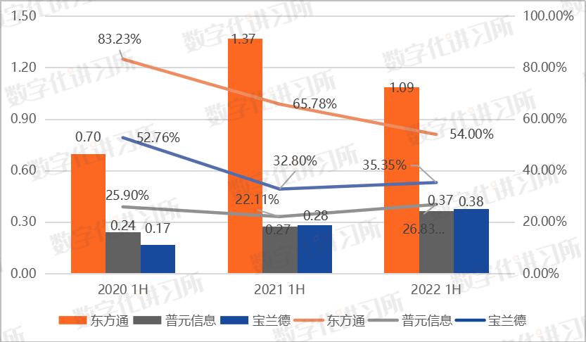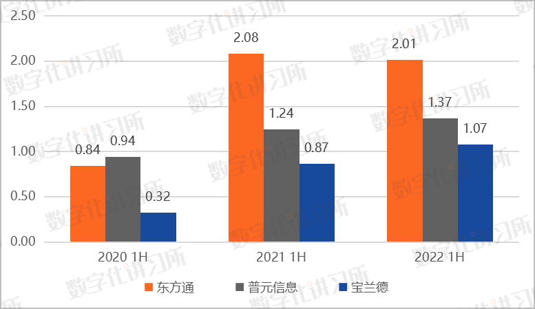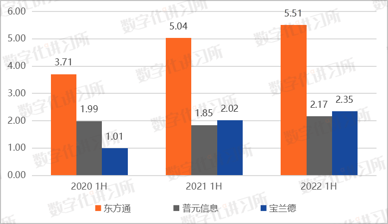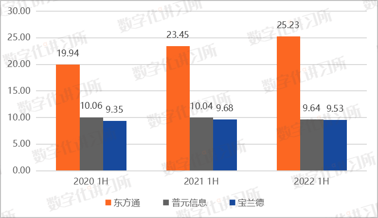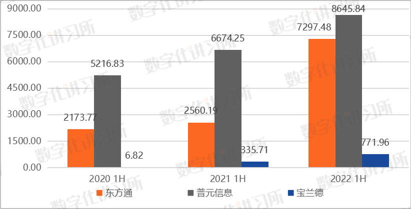 二、东方通资产规模最大,宝兰德盈利能力突出,普元信息金融行业营收高(一)东方通2022年上半年资产规模超普元信息、宝兰德(二)2022年上半年,东方通营收最高,但是唯一一家出现同比下降(五)2022年毛利润变动幅度不高,宝兰德毛利率一骑绝尘(六)宝兰德2022年上半年营业成本仅为普元信息8.93%(七)研发支出或增或减,东方通降20.69%仍为最高值三、三家公司盈利能力稍显差异,谁资本市场表现更佳?(一)东方通市值分别超出宝兰德、普元信息6倍、4倍(二)应用软件行业板块涨幅榜榜上有名,东方通排名最前北京东方通科技股份有限公司(简称:东方通,300379.SZ)成立于1997年,2014年在深交所创业板上市。东方通是工信部和中关村科技园区的投资企业,也是国内首家在A股上市的基础软件厂商。东方通创始业务是为企业级用户提供基础软件中的中间件产品研发、销售及相关技术服务,但另一方面也在基础软件、信息安全、网络安全、5G创新应用等产品和解决方案上不断拓展。普元信息技术股份有限公司(简称:普元信息,688118.SH)创立于2003年,是专业的软件基础平台产品及解决方案提供商,于2019年在上交所科创板上市。普元信息拥有国家级企业技术中心、博士后科研工作站。普元信息主要面向金融、电信、政务等行业的大中型企事业单位,为其提供创新的软件基础平台产品及相关技术服务。北京宝兰德软件股份有限公司(简称:宝兰德,688058.SH)成立于2008年,专注于以中间件为核心的国产基础软件的研发和技术服务,是中国领先的基础软件供应商,于2019年在上交所科创板上市。宝兰德借助其在中间件领域的深厚技术积累,推动自主中间件产品广泛应用于中国移动、中国电信、中国联通等三大电信运营商。在早期的中间件软件行业中,国际知名厂商IBM和Oracle以领先的产品技术占领了市场,国产化力量薄弱,发展核心技术迫在眉睫。近些年来,随着我国对提高企业自主创新能力的重视,IBM和Oracle在国内市场的份额逐渐降低。国产化力量异军突起,东方通、普元信息和宝兰德三家厂商不仅是国家认定的国家规划布局内重点软件企业,也是国内中间件领域的开拓者和领导者。本文中,零壹智库、数字化讲习所将对三家中间件厂商2022年上半年的经营情况进行对比分析。二、东方通资产规模最大,