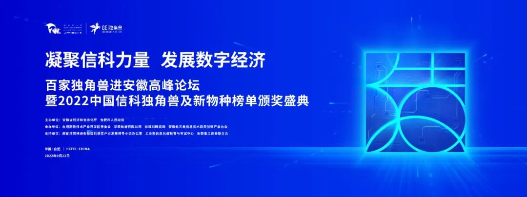 9月22日上午,“2022世界制造业大会”平行分论坛“百家独角兽进安徽高峰论坛暨2022中国信科独角兽及新物种榜单颁奖盛典”在合肥召开。本次论坛由安徽省经济和信息化厅、合肥市人民政府主办,合肥高新技术产业开发区管委会、华云数据有限公司、长城战略咨询、长三角信息技术应用创新产业协会承办。