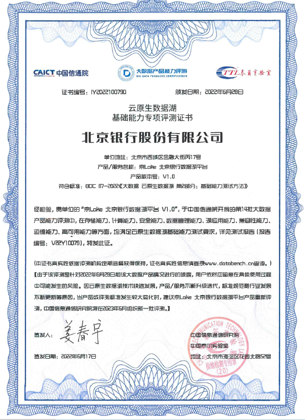 北京银行“京Lake”数据湖平台历经4年的核心能力研发,凭借产品的技术创新顺利通过中国信通院云原生数据湖评测。“京Lake”在所有检测项中均表现出色,顺利获取“中国信通院云原生数据湖基础能力专项评测”证书。