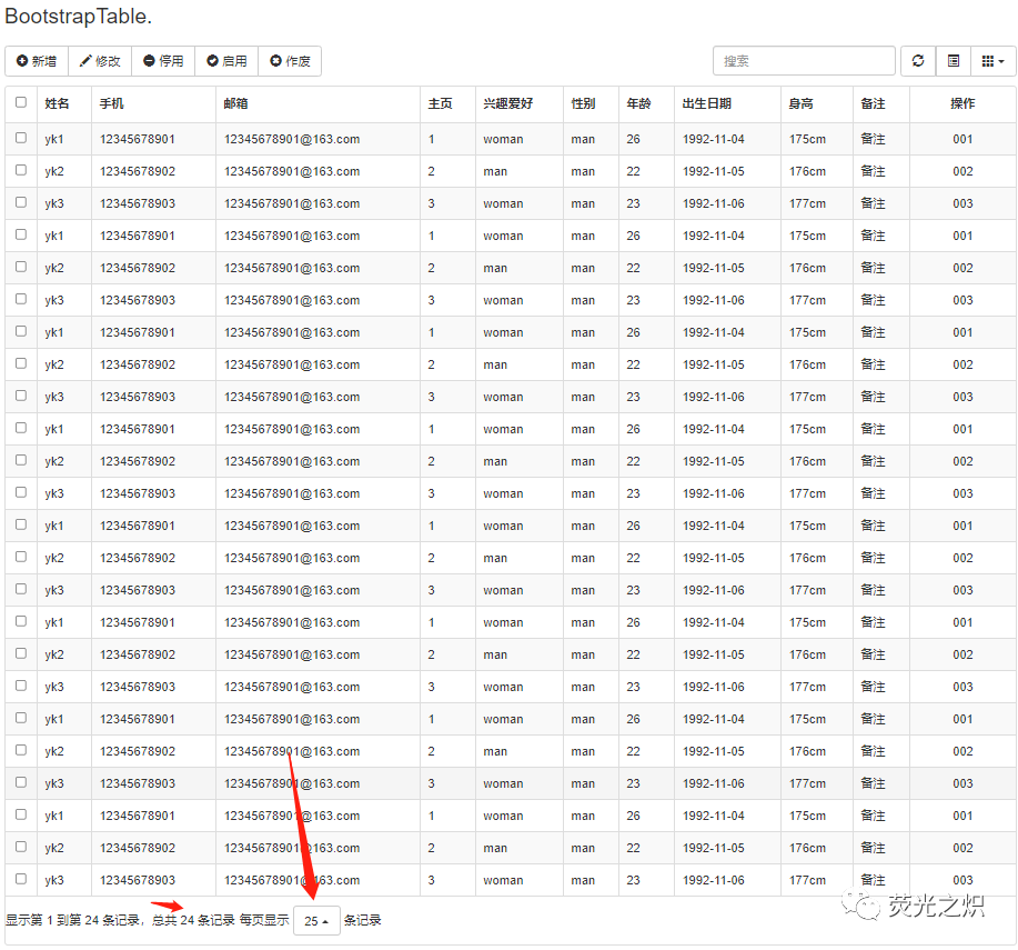 拓展:bootstrapTable有后台排序功能,这里就不提及了,后续会出讲解实现分页功能的文章,现在来说说前台排序功能,bootstrapTable可以控制一页可以展示多少数据量,数据量一大和多排序就方便查找了,点击每列列头,将当前页面table数据排序。